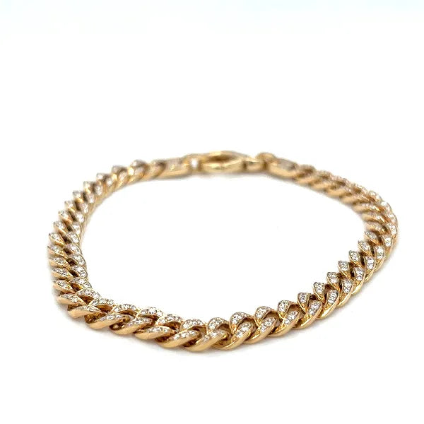 This bracelet is created in 14 karat yellow gold and is set with 1.58 carats of diamonds.