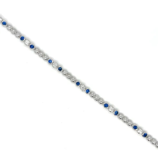 This bracelet is created in 14 karat white gold and is set with 0.37 carats of diamonds and 1.10 carats of sapphires.