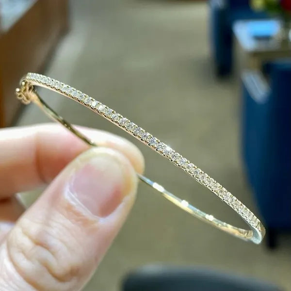 This 14k yellow gold bangle bracelet set with .50cttw of sparkling diamonds. The slightly oval shape makes it very conformable to wear, while the safety clasp ensures it stays securely on your wrist.
