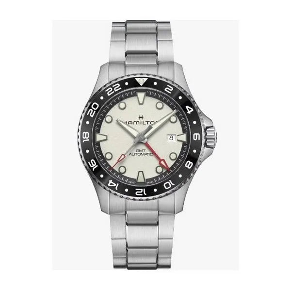 Designed for modern mariners and salty sea dogs, the Khaki Navy Automatic GMT is the ultimate traveler's watch, thanks to its precise timekeeping across multiple time zones. Boasting a stainless steel case with a brushed bracelet, the grained white dial is accented by light green Super-LumiNova® indexes, while a red hand indicates the GMT function and facilitates the unmissable reading of the second time zone. Featuring 30-bar water resistance, screw-down crown and a power reserve of up to 80 hours, the Khaki Navy Automatic GMT will ensure you dive into new horizons with confidence and style.