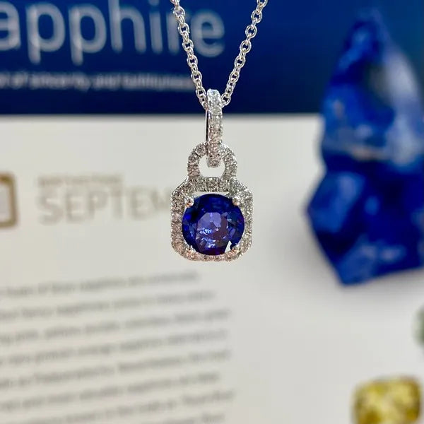 14k white gold necklace featuring a 1.2cttw Sapphire and .30cttw of sparkling diamonds.