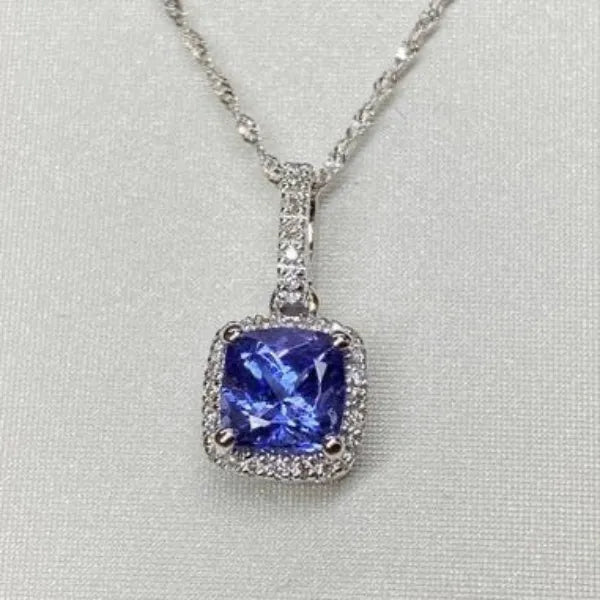 14k white gold necklace features a 1.07 Ct cushion cut tanzanite and .10 cttw of sparkling round brilliant diamonds. 18 inch 14k white gold cable chain included.