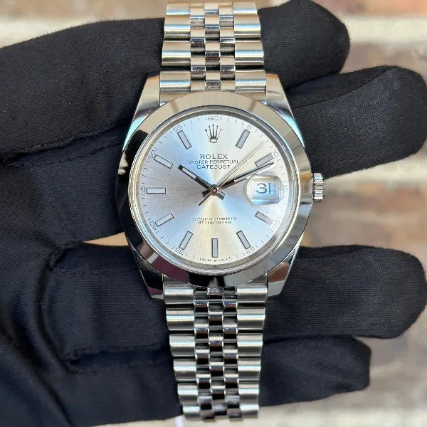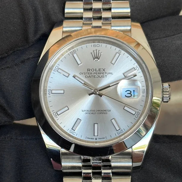 Pre-owned Rolex Datejust 41mm, style: 126300. Smooth bezel, jubilee bracelet. Comes with original box and papers. Circa 2020