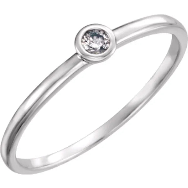 This dainty 14 karat white gold ring is bezel set with a gorgeous 0.06 carat diamond. The ring is size 7.