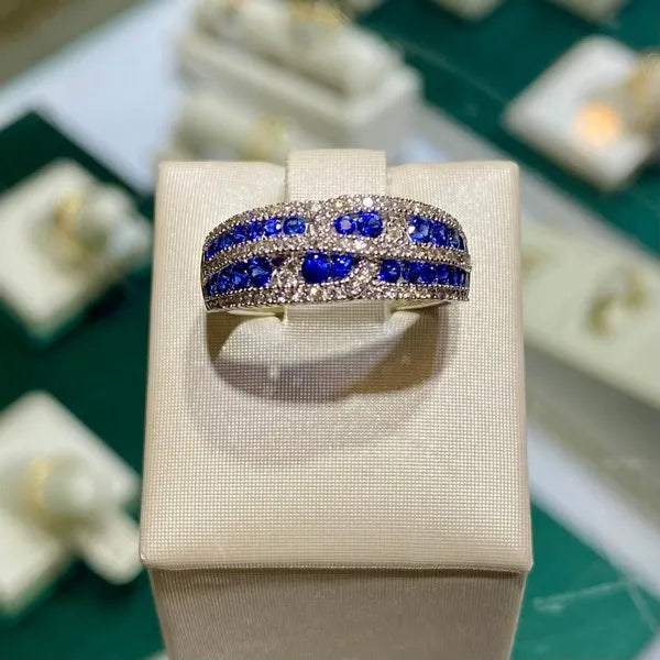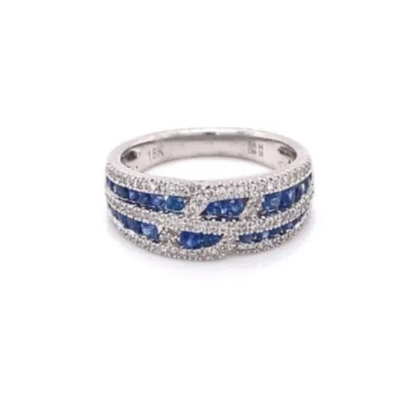 This ring is made in 18k white gold and features .64cttw of ceylon blue sapphires and an additional .38cttw of accent diamonds. Size 6