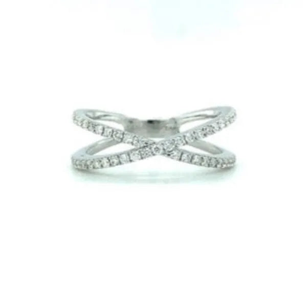 This unique ring features a crossover design accented with .37cttw of sparkling diamonds. Crafted in 14k white gold. Ring size 7.
