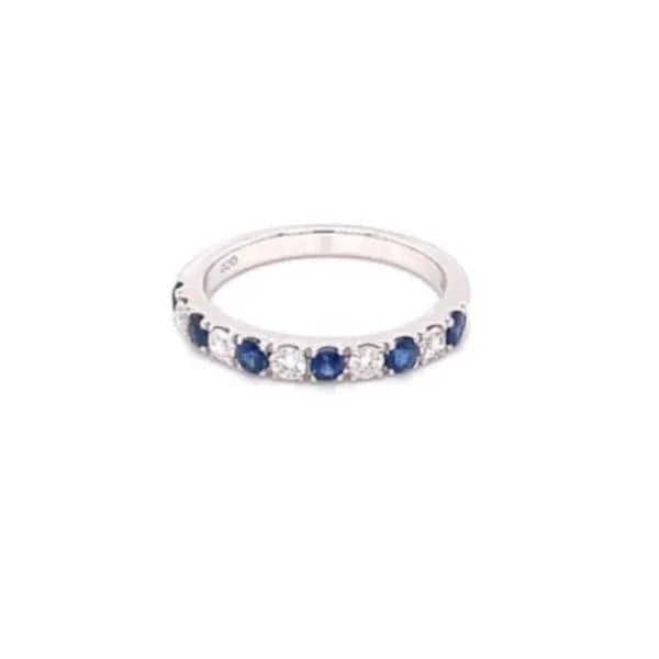 14k white gold band featuring .48cttw of sapphires and .32cttw of sparkling diamonds. Size 7