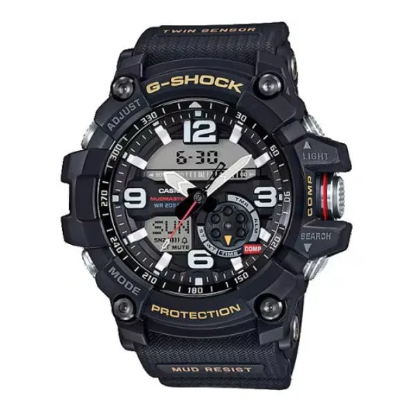 This is a Twin Sensor model from the G-Shock Mudmaster Series, designed for use in extreme environments scattered with rubble, dirt and debris.  With a push of one large button at the 3 o'clock position, you can check your position with its Compass. The temperature can also be measured easily by pushing the button at 4 o'clock. This model has been developed with operability in mind so that anyone can intuitively check their position using the Compass, even in the most extreme climates, without visual observation. The dust and mud-resistant button guard cylinder structure prevents fine sand and mud from getting into the buttons while also helping to absorb any shock to the buttons and improving operability. Broad hour/minute hands and indices of large Arabic numerals have also been adopted to improve visibility. This design is packed with military-style flare, including a mode display that uses a sprocket-inspired disk dial and a textured band to prevent slipping.