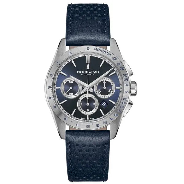 Made for those who favor function and style at once, the Jazzmaster Performer line offers a powerful sport-chic appearance. Powered by the H-31 automatic chronograph movement with 60 hours power reserve, this Jazzmaster Performer Automatic Chronograph features a 42mm stainless steel case accented by a sleek blue dial and a matching racing-style perforated blue leather strap.