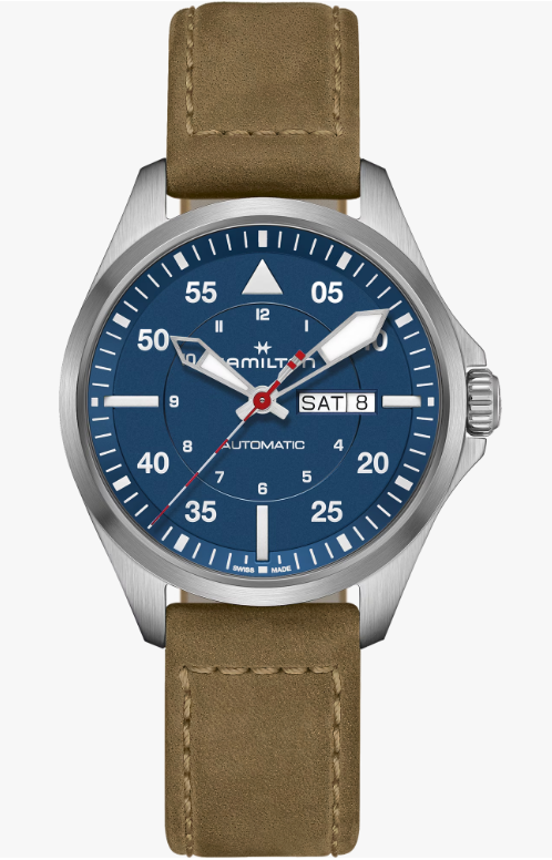 Dedicated to a unique partnership with the courageous Air-Glaciers, this special edition Khaki Aviation Pilot marks a collaboration like no other. Featuring a blue dial and a hypoallergenic, lightweight titanium 42mm case, it's a timepiece that's both durable and easily wearable. Pairing our signature H-30 automatic movement, 80-hour power reserve and a nylon outer, leather lined Velcro strap for maximum customization, this is a timepiece that's always ready for action.