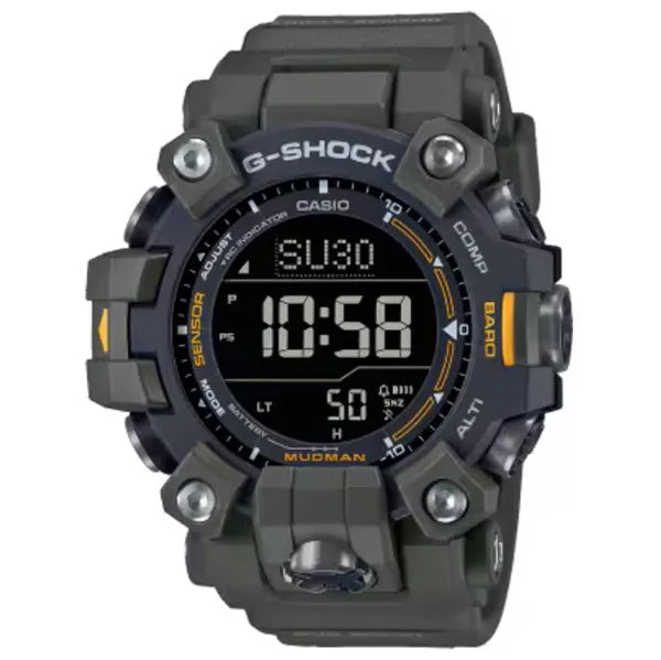 Dark Green G-SHOCK MUDMAN: Where Precision Meets Power Dive deep into the realm of unparalleled durability with the G-SHOCK Master of G MUDMAN in a captivating dark green with intricate black details. This color combination doesn't just make a statement; it's a testament to the wearer's love for elegance intertwined with ruggedness. Triple-Sensor Design for the Avid Explorer Designed for professionals who venture into the most challenging environments, this watch stands out with its powerful triple-sensor capabilities. The MUDMAN's hallmark is its uncompromising mud-resist construction, ensuring that even the most grueling terrains won't compromise its functionality. Functional Excellence Down to the Buttons Be it the large, user-friendly front button or the three direct sensor buttons, each has been meticulously crafted to drain off mud and water swiftly. Cylinder-shaped stainless steel components protect these buttons, while gasket fittings shield the button shafts from mud and dust, preparing you for any adventure. Innovation on Display: Dual-Layer LCD The MUDMAN doesn't just tell the time; it speaks to the adventurer in you. With a dual-layer LCD, access vital data like altitude, temperature, and barometric pressure right from your wrist. The innovative Carbon Core Guard structure, paired with a thin module design, encapsulates these functionalities in a slim and compact form, promising a comfortable fit. More than Just a Watch: A Navigator on Your Wrist The digital compass, enhanced by the dual-layer LCD, is your reliable partner in uncharted territories. It displays vivid compass graphics on the top, while time and other essential readings reside below. With models like GW-9500-3 and GW-9500-1A4 boasting a negative dual-layer LCD, your watch becomes an emblem of state-of-the-art tech. Powered by the Sun, Ready for the Night Taking innovation a step further, the MUDMAN comes with radio-controlled solar power, ensuring precision in timekeeping while harnessing light's power. The Super Illuminator feature guarantees that even in the darkest corners, your timepiece will shine bright. Sustainable, Yet Stylish The dark green case, bezel, and urethane band are not just aesthetic marvels. They are crafted from bio-based resins, underscoring Casio's commitment to renewable resources. And as a nod to its legacy, the case back proudly flaunts an engraving of the iconic MUDMAN mole, compass in hand.