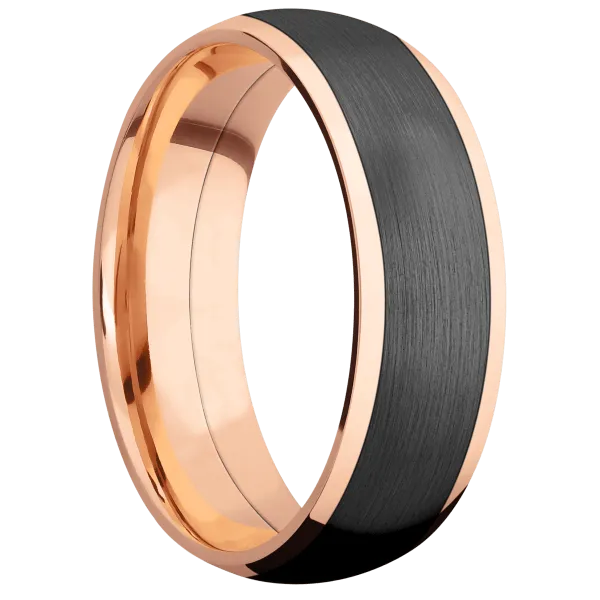 7 mm wide/Domed/14K Rose Gold band with one 5 mm Centered inlay of Zirconium.