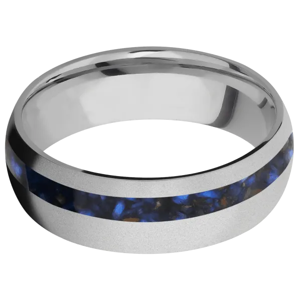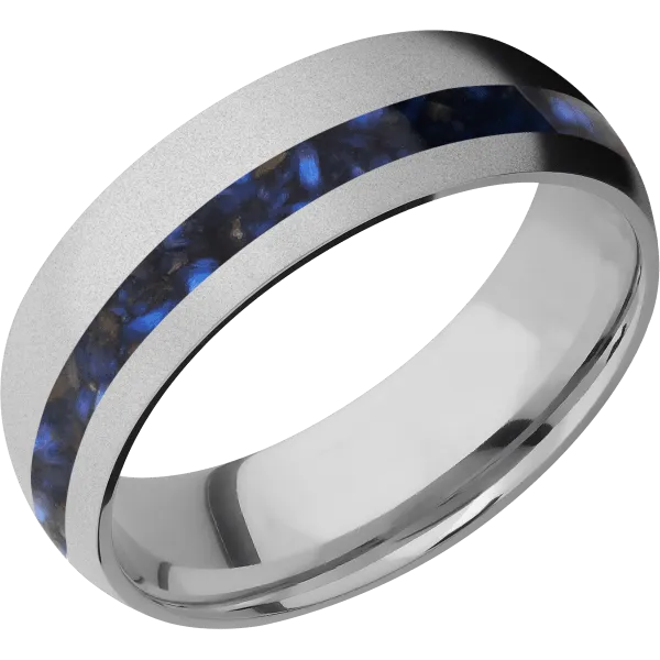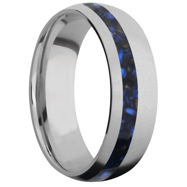 7 mm wide/Domed/Titanium band with one 2 mm Off Center inlay of Blue Tiger Eye.