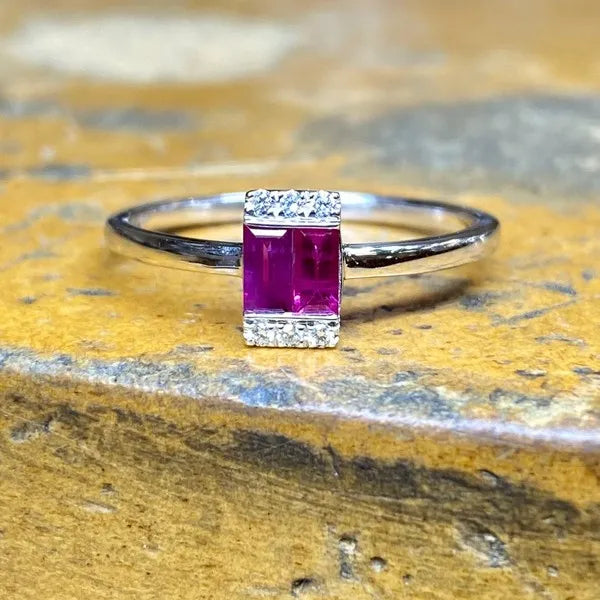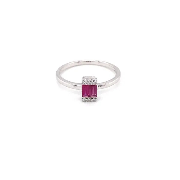 This petite style 14k white gold ring features 0.25 cttw of baguette rubies bordered by .04 cttw of round brilliant diamonds.