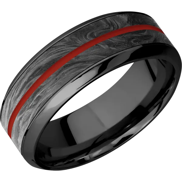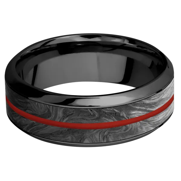 8 mm wide/High Bevel/Zirconium band featuring inlays of Forged Carbon Fiber and Red Apple.