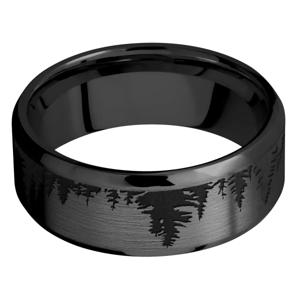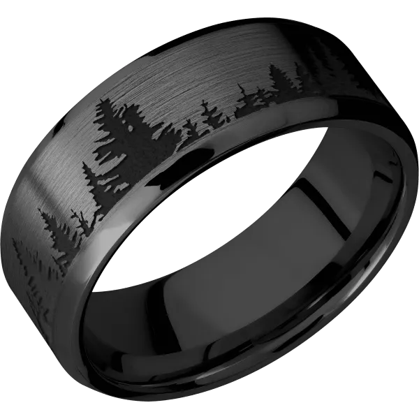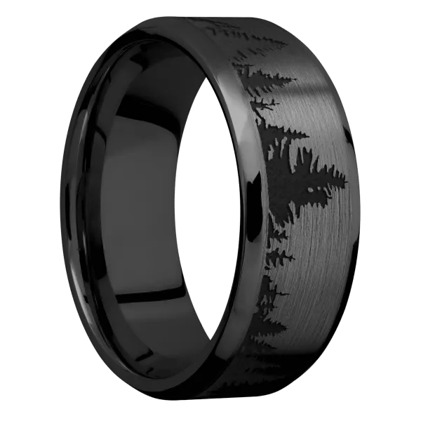 8 mm wide/Beveled/Zirconium band with a laser carved Trees pattern.